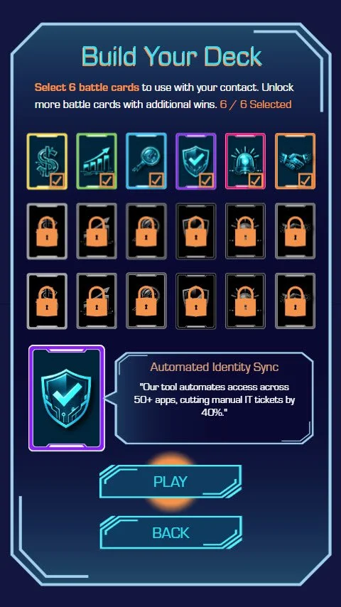 Inspired by Balatro, SaaS Battle Cards is a mobile, roguelike card game for account execs to practice sales strategies on-the-go. Designed with 3 generative AI models (LLMs) & built in Storyline 360 over 3 weeks in my spare time, it demonstrates my ability to create innovative sales enablement tools by combining sales domain expertise with advanced development skills.