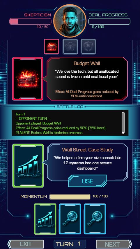 Sales Enablement Expertise - Obstacle types (Budget Wall, Status Quo Comfort, Security Auditor) map directly to real objection categories. Card mechanics reflect actual sales frameworks.