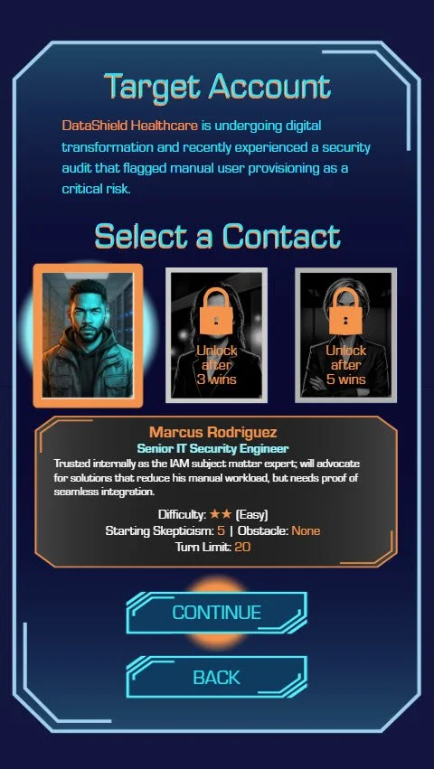Players select their stakeholder—in this prototype, Marcus Rodriguez (Senior IT Security Engineer) an easy-difficulty contact with no active starting obstacles and Skepticism at level 10. Two additional personas are mocked up as locked content to demonstrate scalability.